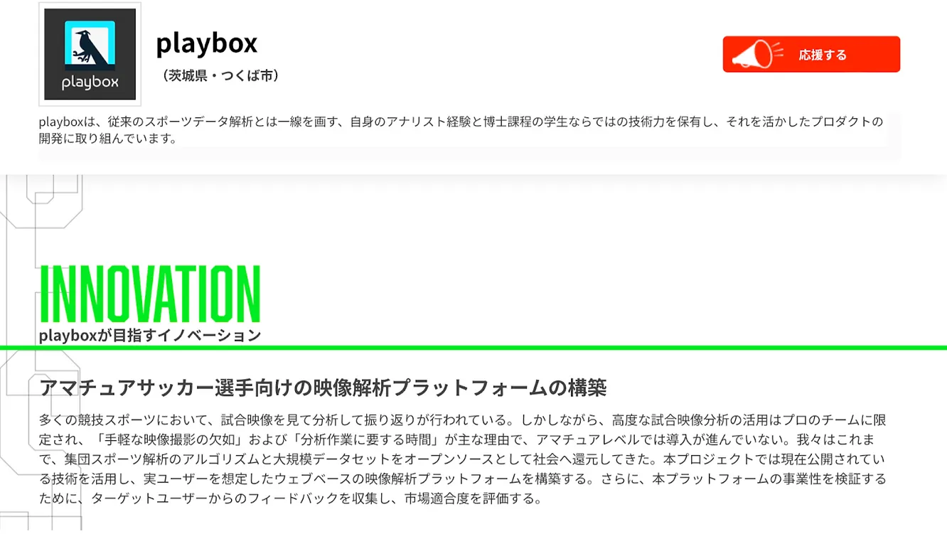 We are very pleased that our project "playbox" has been selected for the ICT Startup League. This project started from my experience as an analyst at the University of Tsukuba, and I am hopeful that through this program we will be able to further advance our activities! We look forward to delivering the finished product to our users!