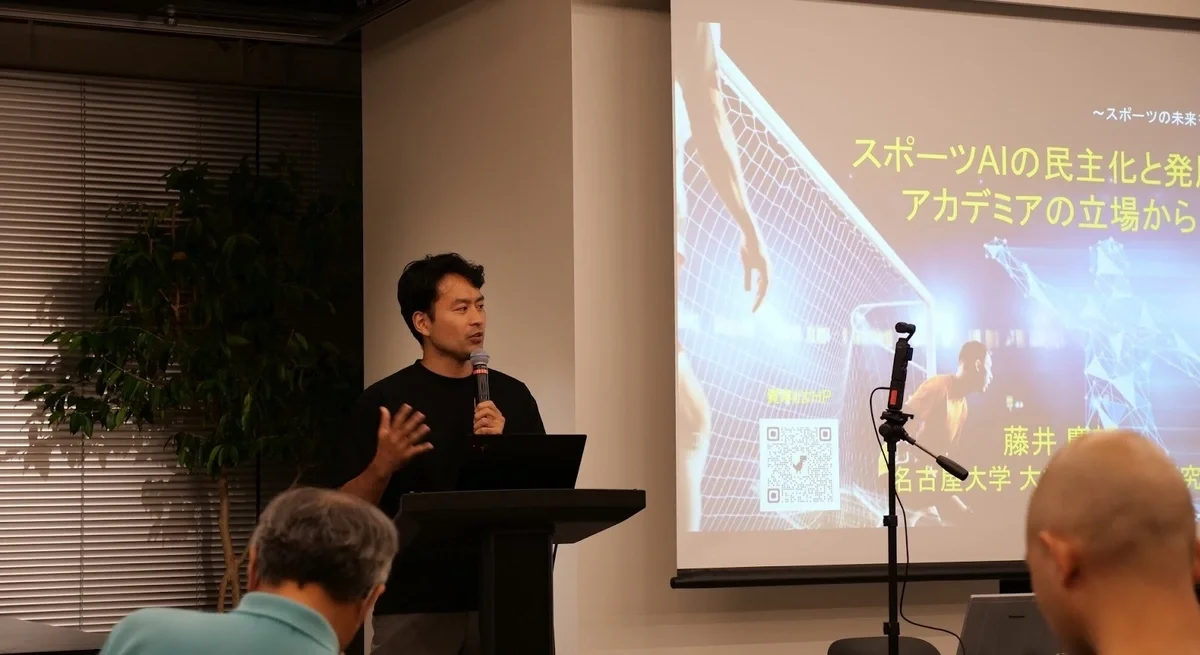 Dr. Fujii of Nagoya University introduced the forefront of sports AI research and the concept of "sports AI that anyone can use. How AI research can solve problems close to the field, such as automatic data acquisition through video analysis and quantification of action values.