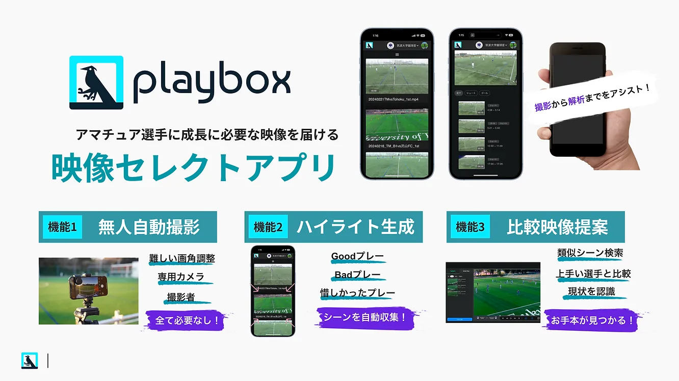 Playbox는 츠쿠바대학교 축구부(이하 축구부)와의 실증 실험을 통해 영상 선택 앱 'Playbox'의 기능 검증을 진행하고 있다. 이번 검증에서는 이 앱의 하이라이트 생성 기능을 킥복싱부 B1팀에 시범적으로 제공하여 스포츠 현장의 영상 활용에 대한 과제 검증을 진행하고 있습니다.