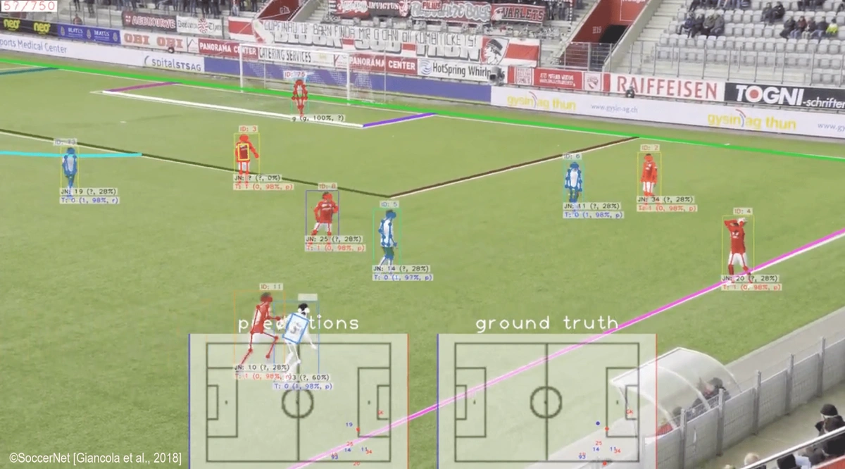 原始视频由 SoccerNet 提供 [Giancola 等人,2018] / 跟踪结果:来自此倡议。